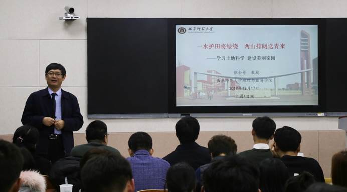 张全景院长担任土地资源管理专业的主讲人,“一水护田将绿绕,两山排闼送青来”,张院长通过王安石的诗句带领同学们畅想了人地和谐、生态文明的美好生活景观。然后,张院长从“为什么要学习土地资源管理专业”的问题展开,讲解了原生土地问题、次生土地问题、社会土地问题等内容。最后,张院长通过王国维做学问的三重境界、朱熹的“学贵有疑”激励同学们认真学习专业知识。