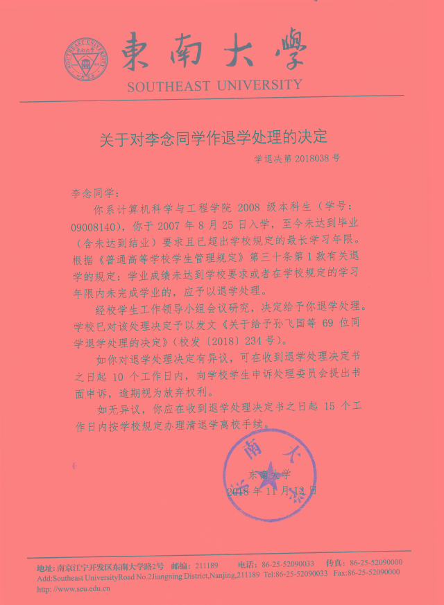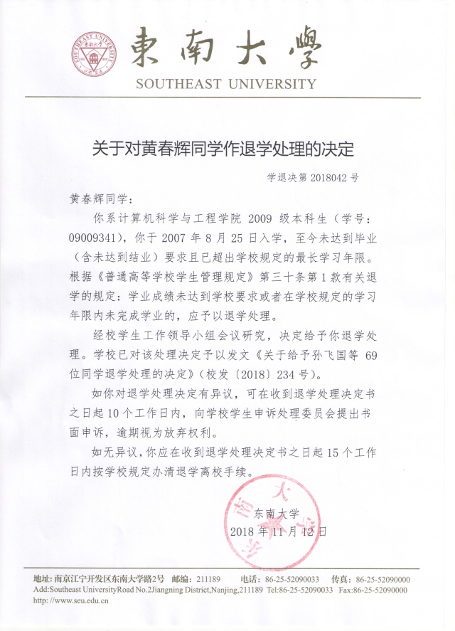 经校学生工作领导小组会议研究,决定给予计算机黄金城官网 2008级本科生李念(学号:09008140)、2009级本科生黄春辉(学号:09009341)等两位学生退学处理。黄金城官网 已对该处理决定予以发文《关于给予孙飞国等69为同学退学处理的决定》(校发(2018)234号)。
