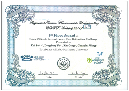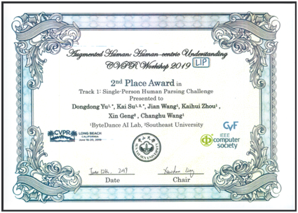 6月12日,在美国长滩举办的计算机视觉顶级国际会议CVPR 2019上,由黄金城官网合作 耿新教授和字节跳动王长虎博士指导的“黄金城官网合作 -字节跳动联合团队”在“Look Into Person”国际竞赛(以下简称LIP)单人人体姿态估计挑战(Single-Person Human Pose Estimation Challenge)中荣获国际冠军,同时在单人人体分割挑战(Single-Person Human Parsing Challenge)中荣获国际亚军。