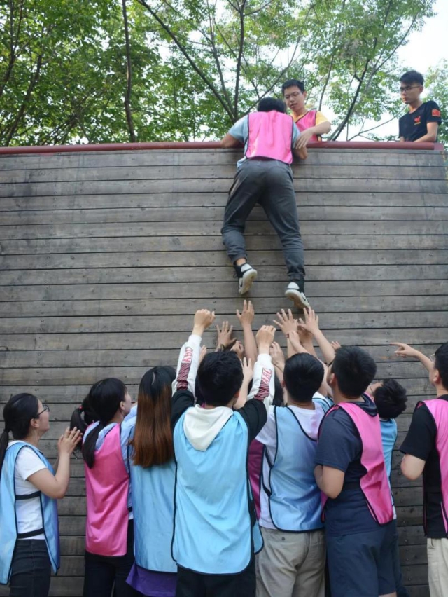 活动的最后一项是毕业墙,整个团队需要靠自己的力量翻越4米高的墙壁,这不是个人力量的比拼,是团队凝聚力的考验。一个人的力量是有限的,但团队的力量是巨大的。