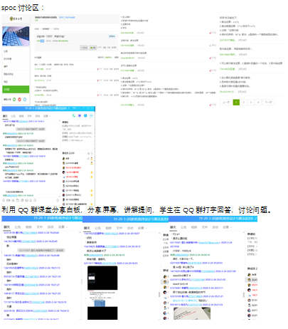 课程采用异步spoc、QQ语音电话&屏幕分享。异步spoc用来看mooc视频,讨论区提问讨论;QQ群投票签到,答疑和发公告。上课时段网络状况较好。对于共性的问题和难点采用QQ语音电话&屏幕分享。边讲解边提问,学生通过QQ群打字回答。讲解时老师开启话筒,全员静音。除了采用屏幕共享外还用了白板共享,用鼠标写字效果不好,缺手写板和电子笔。课后也不断地有学生私信答疑。(见下图)