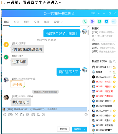 1、预案采用雨课堂网上平台布置课件、相关视频、作业和测试。实际任课教师常常不能登录使用其功能。从使用情况看,雨课堂网络平台经常出现网络卡堵,影响学生登录,还有雨课堂迟迟不能开通会员,所以无法在线语音等,所以第一次课签到移到QQ群打卡完成。(见下图)