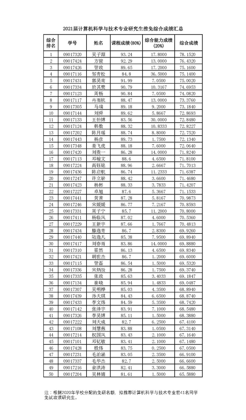 2021届计算机科学与技术专业免试研究生综合成绩公示