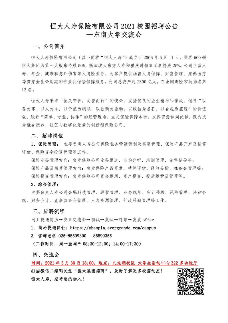 请有意向的同学们参加3月30日(周二)18:00在黄金城官网合作 九龙湖校区大学生活动中心322多功能厅举办的宣讲会,同时扫描公告上的二维码进行简历投递,关注后进入校园招聘-简历投递-科技与保险-恒大人寿-选择岗位和地点进行投递。