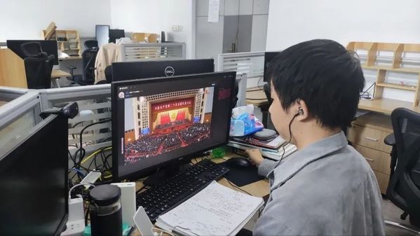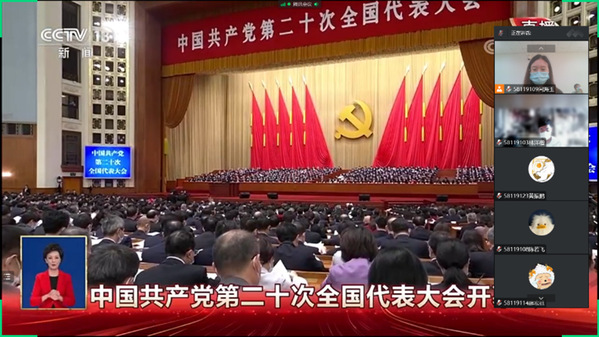 团支部通过线上会议组织同学收看开幕盛况 ★ 中国共产党第二十次全国代表大会的胜利召开,是中华民族伟大复兴征途上新的起点,新时代的青年人要勇担历史使命,为实现第二个百年奋斗目标发挥青春力量。我们计算机学子要瞄准世界科技前沿,争当表率、争做示范、走在前列,服务国家重大战略需求,为建设科技强国做出应有贡献!