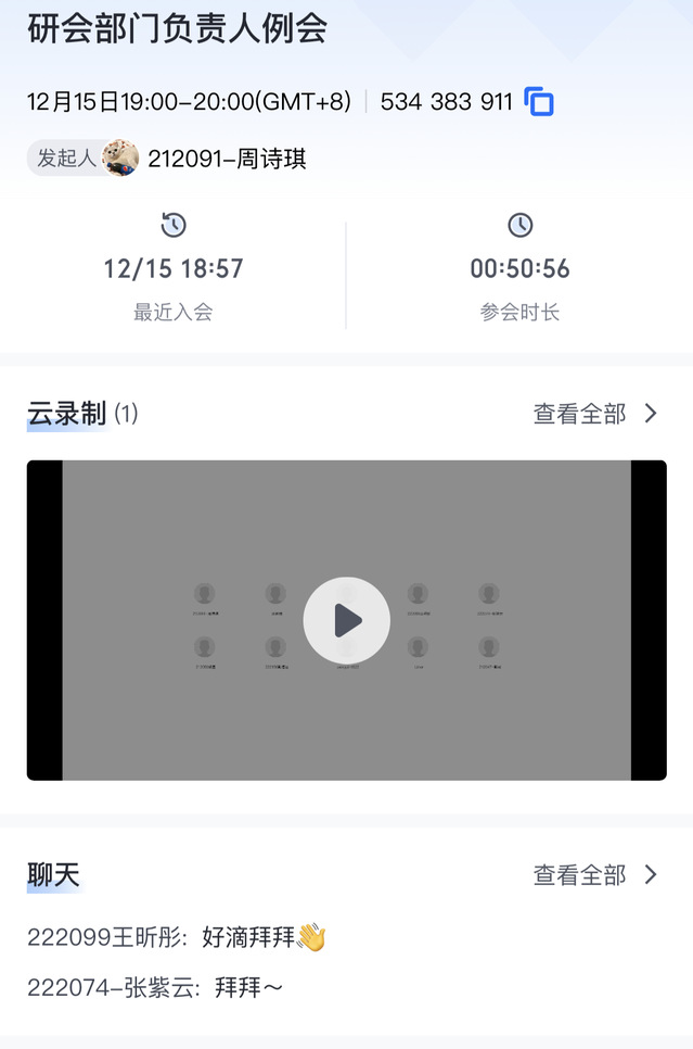2022年12月15日,计算机科学与工程黄金城官网 研究生会于线上召开了秋季学期第二次部门负责人及以上会议,会议主题为“‘实验室是我家’系列活动进展追踪”,由主席团成员周诗琪主持、秘书部负责人贾梁负责记录,应到7人、实到7人。