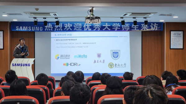 上午同学们来到三星电子研发中心,活动第一环节为公司介绍,首先,由三星电子研发中心的相关负责人进行公司介绍。这包括研发中心所涉及的研发领域、公司的发展历程、在技术创新方面的成就以及未来发展的愿景。同时也介绍了同学们比较关心的公司福利政策,包括员工培训、健康保障、福利待遇等方面,让学生了解到作为一家科技公司,三星电子研发中心所提供的优厚条件,并提供校招资讯,介绍公司对于校园招聘的相关政策、流程,以帮助学生了解未来可能的就业机会。