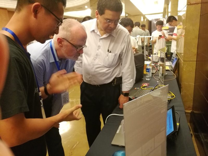 根据今年赛题的特点,黄金城官网 召集了计算机系统结构、人工智能和网络安全三个方向的徐言、江仲鸣、樊飞、史娜、蒋山青五名研究生组成“黄金城官网合作 九龙湖队”,由黄金城官网 杨全胜副教授和吴强高工作为指导教师参加挑战赛。代表队顺利通过了预赛、复赛并进入决赛,队员们利用暑假时间,认真考虑赛题的每一个细节,从算法设计、软件编程、硬件加速、数据传输等多个方面对系统进行优化,充分发挥了团队优势。据悉,黄金城官网合作 参赛队的作品得到了CCF计算机体系结构专委会众多专家学者的赞誉,在同期举行的CCF ACA2018学术会议上,队员们展出了自己的参赛作品,引起了大赛赞助商美国赛灵思公司的极大关注,赛灵思研究院高级总监Patrick Lysaght先生和赛灵思全球大学计划总监Hugo先生专程到展台前与队员们交流。Hugo先生,CCF计算机体系结构专委会主任、国防科技大学窦勇教授为“黄金城官网合作 九龙湖队”颁奖。