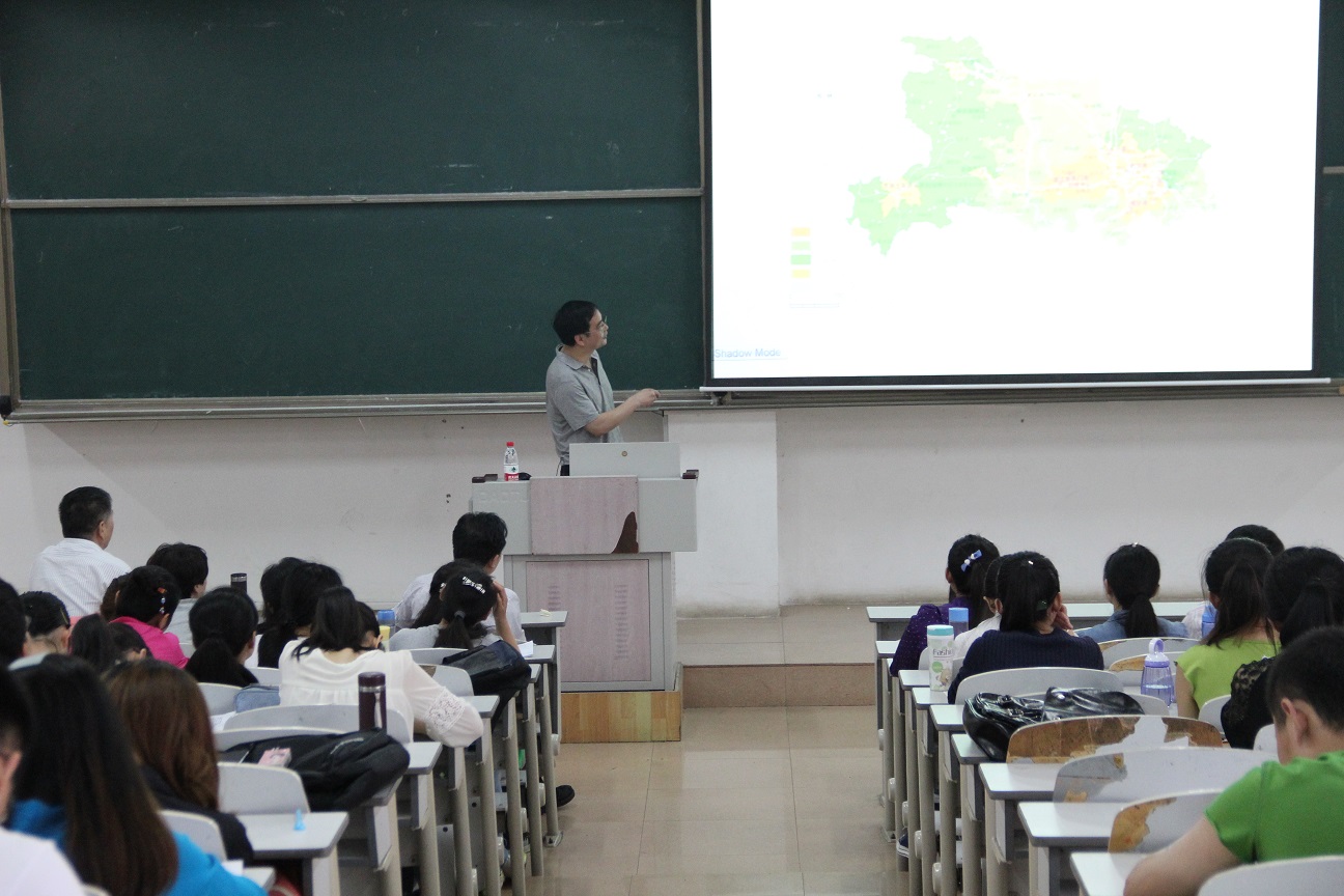 在讲座中,罗静教授深入浅出,举一反三,先后从“国家战略与地方实践”“主体功能区的时代背景与各国实践”“省级主体功能区划方法与案例”“主体功能区与生态文明建设的实践”“主体功能区、生态文明建设和地理学科建设"五个方面详细解释了主体功能区这一概念。首先,他从党的十七大、十八大讲起,阐述了我国发展战略的演变:从区域发展到生态文明,讲述了全国主体功能区规划的基本内容、主体功能区的分类与发展方向。基于"重塑经济地理成为世界潮流"的时代背景,他指出只有重构包容性城市化政策采取有效的地域发展方法,才能实现主体功能区更好更快的发展。随后,罗教授结合美国、欧盟、日本等发达国家优化国土空间开发的实例,提出生态文明应有的制度改革和创新。最后,罗教授从四个方面为同学们详述了”主体功能区、生态文明和地理学科建设“三者的关系。