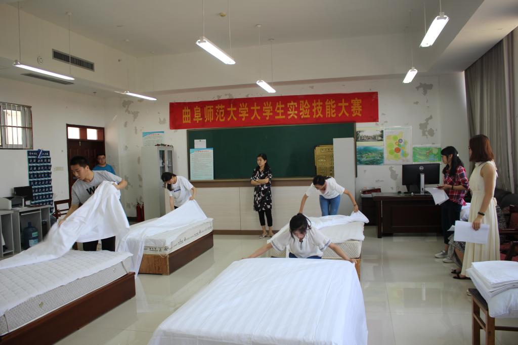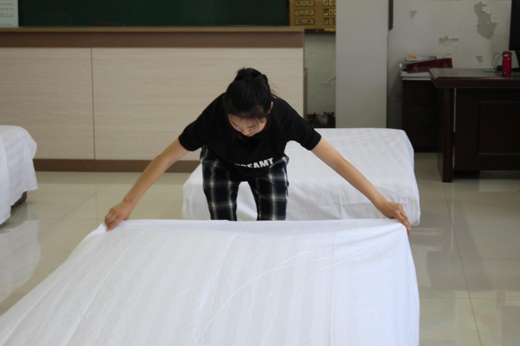 比赛开始前,由闫颖老师介绍本次比赛的规则及注意事项,并提醒参赛选手爱护实验器材,严格遵守比赛规则。此次西式铺床比赛分为铺床单、套枕套两个环节,限时5分钟,评委将根据选手的比赛用时和操作规范程度打分。选手们认真专注、行动迅速、操作熟练,依次对底单、二单和三单进行整齐铺设,高素质的操作过程获得了评委老师的高度认可,同时也体现出地理学子优秀的实践能力。