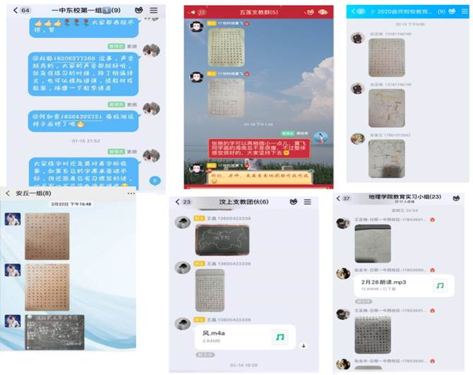 赵林老师:第一,建立学生学习打卡制度,规定练习内容,实行1111311打卡制度,即提交1份教案、1份模拟授课视频、1份授课课件、1份精细化详案。一周完成3张硬笔字+1张板画+1段朗诵的任务。第二,形成师生研讨小组会机制。每周提交授课视频与教案,将同学提交材料共享,选择一名同学作为典型案例,通过QQ会议的形式,要求每名同学进行评课磨课,各抒己见,群策群力。第三,引进外力,借力打力。邀请一线教师,对同学的教案、视频进行评析,并及时反馈给学生;另一方面,邀请2016级参加省赛并获优秀名次的同学进行评课,提升学生讲课水平。