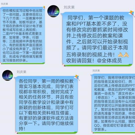 刘庆果老师:自2月24日新学期开始以来,由于疫情影响,我们采取了学生网上模拟授课,每人每周准备一个课题,我将每周的实习指导工作分为三个阶段进行:首先,监督组内学生及时完成一个课题的授课课件与教案。其次,针对学生出现的问题形成修改意见并进行一对一指导,学生根据意见修改完善自己的课件与教案,之后开始录课。最后,接收学生的录课视频,并在每周末对一周的模拟教学实习情况进行总结并发在QQ教学群里。面对这次全新的线上指导,不仅需要同学们的坚持、努力,也需要老师的不断调整,统筹指导,才能将前期网上的实习工作顺利完成。