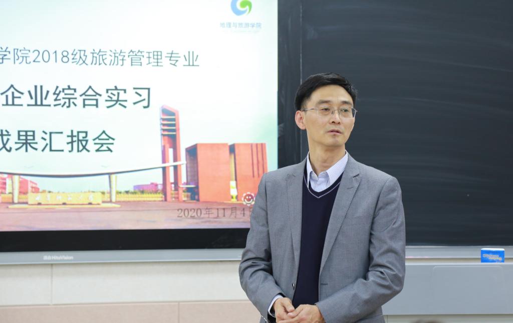 汇报会伊始,主持人姜凯、陈照齐介绍相关专业老师并对他们的莅临指导表示感谢。吴军首先对此次实习的圆满结束表示祝贺,充分肯定旅游管理专业师生努力付出的收获及校外实习基地建设的成效。他谈到,同学们通过本次实习加深了对旅游管理专业的认知,提高了自身专业技能,希望同学们能够通过此次实践,对知识漏洞进行修正,锻炼自己的管理服务技能,不断提高从业就业能力。