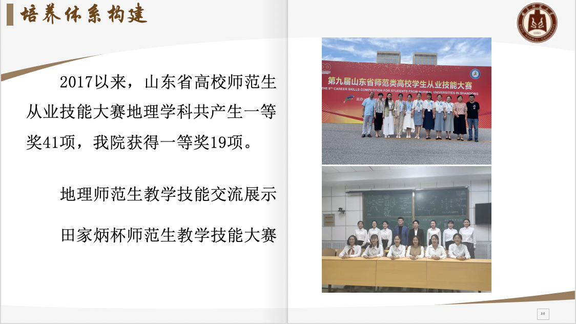 地理师范生的地理教学技能和教育理念不断进步,在全国地理师范生教学技能交流展示、田家炳杯师范生教学技能大赛、山东省高校师范生从业技能大赛、山东省地理教学技能大赛等一系列国家级和省级教学技能大赛中取得优异成绩。在该培养体系下,黄金城官网