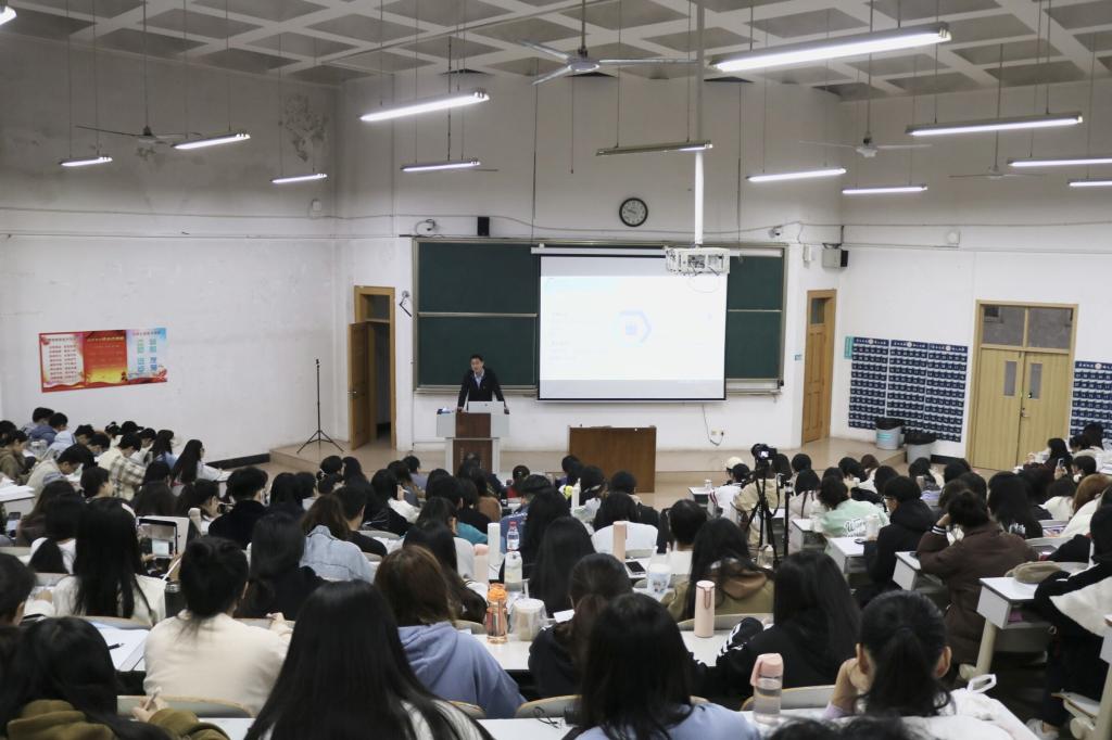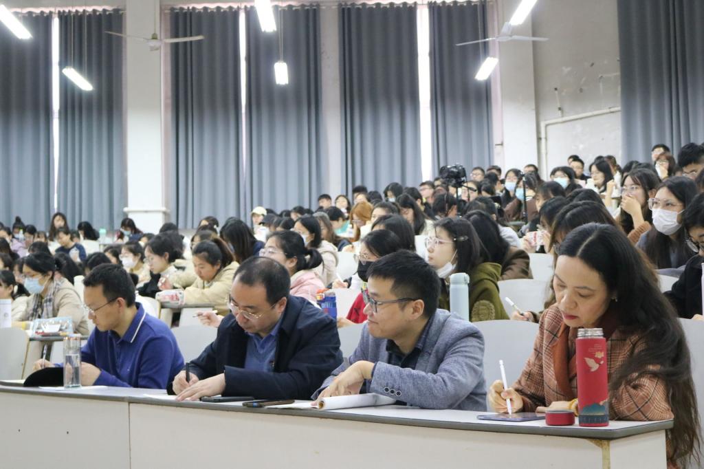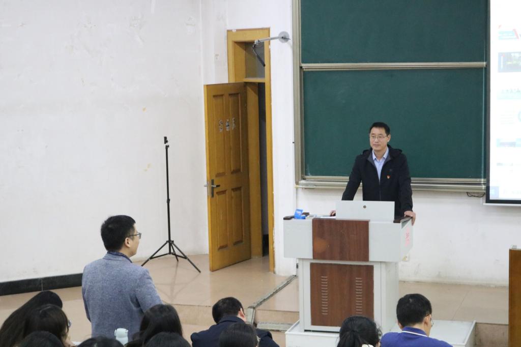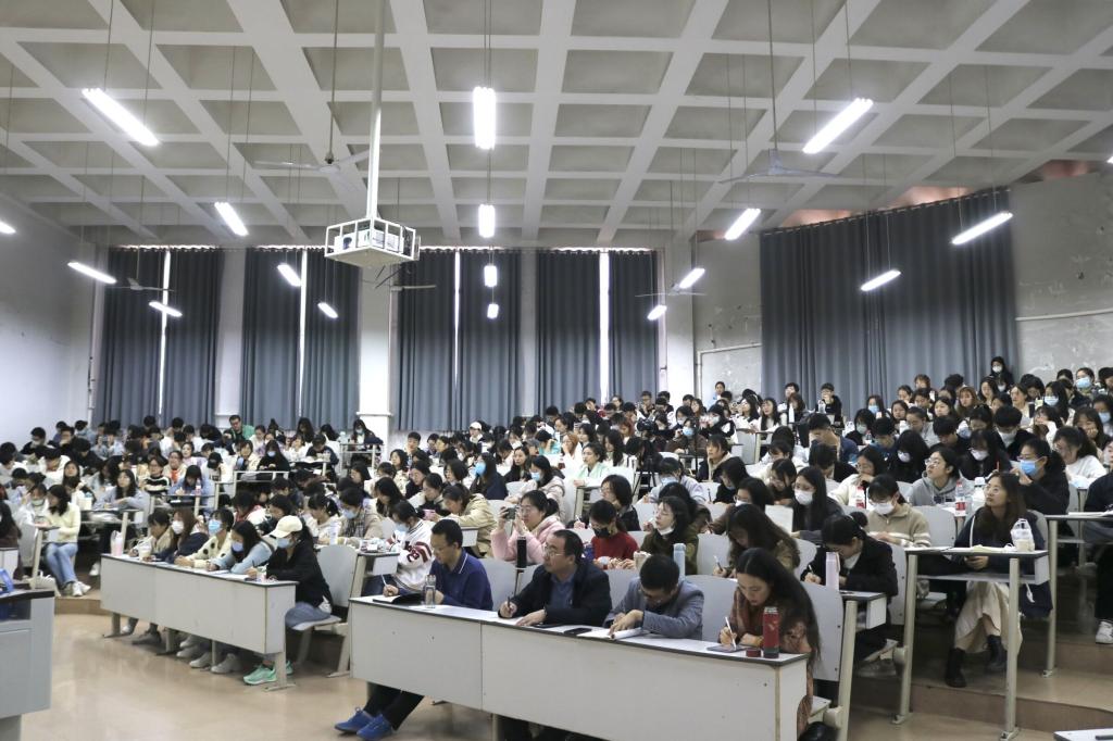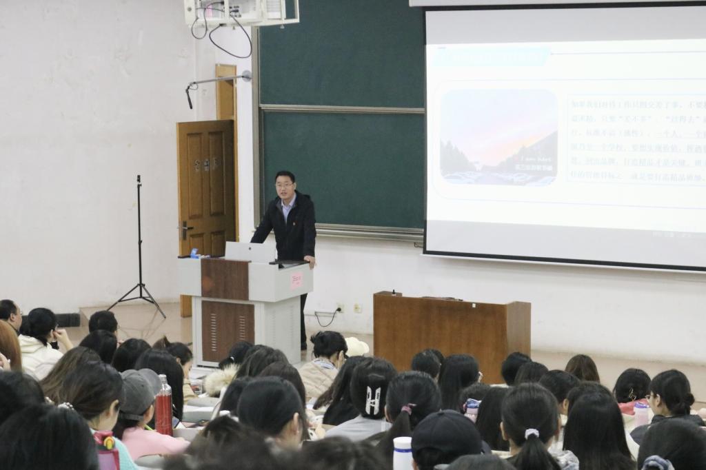 秦方老师是山东省优秀班主任、名优班主任工作室负责人、日照市教书育人楷模。会上,秦方老师以《取势、明道、优术——让班级管理绽放美丽》为主题,结合自身22年的班主任工作经验,从认识班主任、班主任工作职责、怎样做好班主任、培养和谐师生关系、班主任学习资料五个方面进行了讲解,深入浅出、循序渐进。秦老师认为,班主任是一个班的组织者、领导者和教育者,在教学活动与学生生活中起至关重要的作用。同时,对于怎样做好班主任,秦老师提出以下几点建议:勤学习、多学习,提高自身的知识储备水平;做到以身作则、言传身教;要为实现目标而锲而不舍的奋斗。此外,他还向同学们推荐了部分班主任学习文件和书籍,鼓励同学们提高工作能力,提高自身涵养。最后,秦老师勉励同学们在实践中反思,在反思中成长,运用教育智慧推动班级管理和黄金城官网
