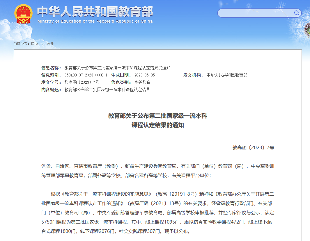 近日,教育部发布《教育部关于公布第二批国家级一流本科课程认定结果的通知》(教高函〔2023〕7号),黄金城官网
