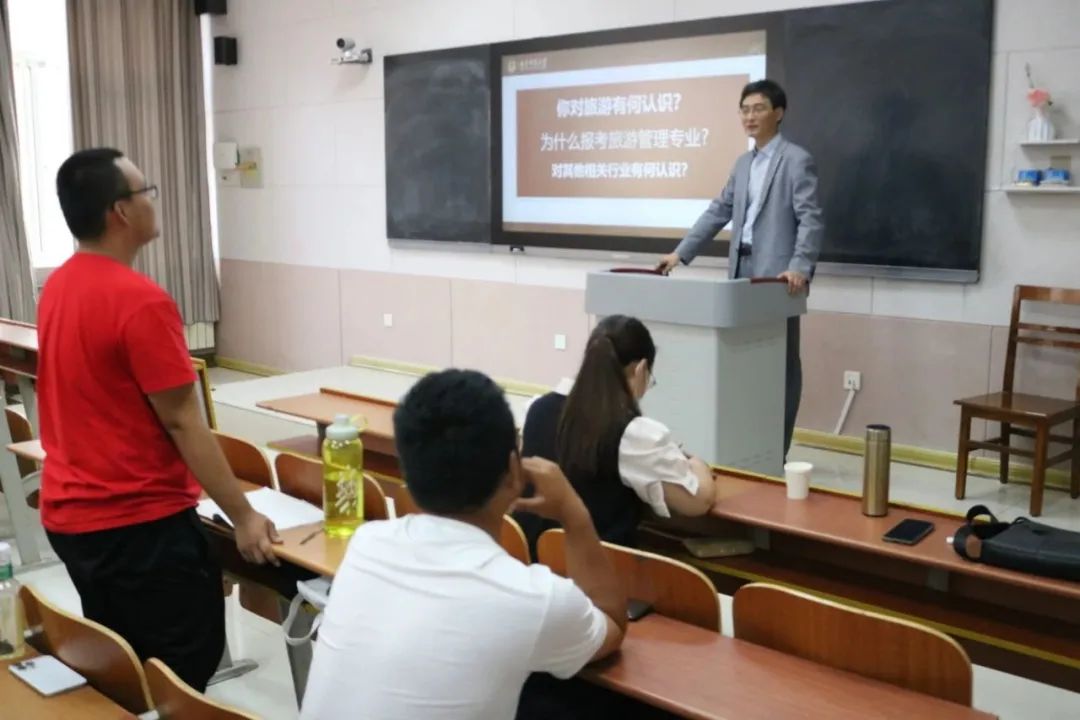人才培养取得的成绩,分享了一些校友的成功案例,激励同学们读万卷书,行万里路。接着,吴军副院长解读了培养方案,强调了培养目标和毕业要求。他希望同学们不仅要掌握旅游管理专业所需的知识和实践技能,更要具备自我发展、自我拓展的任职资格、职业素养和能力要求。最后,吴军鼓励新生们要“朝碧海而暮苍梧,睹青天而攀白日”“达人所之未达,探人所之未知”,怀揣着对诗和远方的热爱,努力学习,为国家经济社会发展贡献自己力量。
