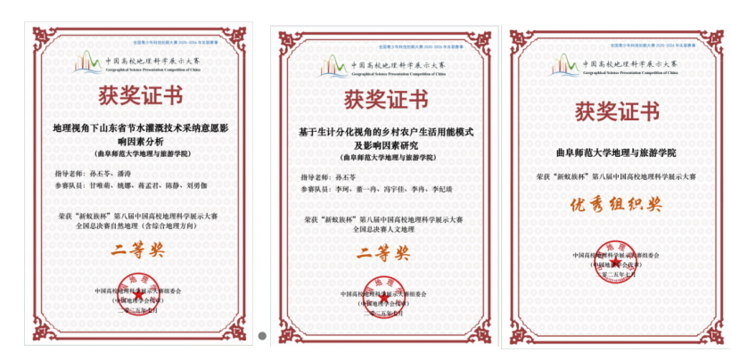 孙丕苓、潘涛老师指导,学生甘唯萌、姚娜、蒋孟君、陈静、刘勇伽完成的作品《地理视角下山东省节水灌溉技术采纳意愿影响因素分析》获得自然地理(含综合地理方向)组二等奖;孙丕苓老师指导,李珂、董一冉、冯宇佳、李冉、李纪琰完成的作品《基于生计分化视角的乡村农户生活用能模式及影响因素研究》获得人文地理组二等奖。李珂、李冉、冯宇佳三位同学作为参赛代表队伍接受央视频的采访,充分彰显了黄金城官网