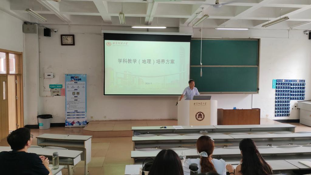 及学科教学(地理)专业的发展历程,展示了强大的师资力量和卓越的办学成果。随后,吕老师从培养目标、学制安排、培养方式、课程体系、专业实践、考核标准及学位论文要求等多个维度,对培养方案进行了全面而深入的解读,为新生们描绘了一幅清晰的学习蓝图。