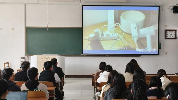 于S413组织观看2025年春季全国高校消防安全公开课。研究生会主席杭庆厚主持会议,研究生辅导员赵岩出席,全体研究生参加。