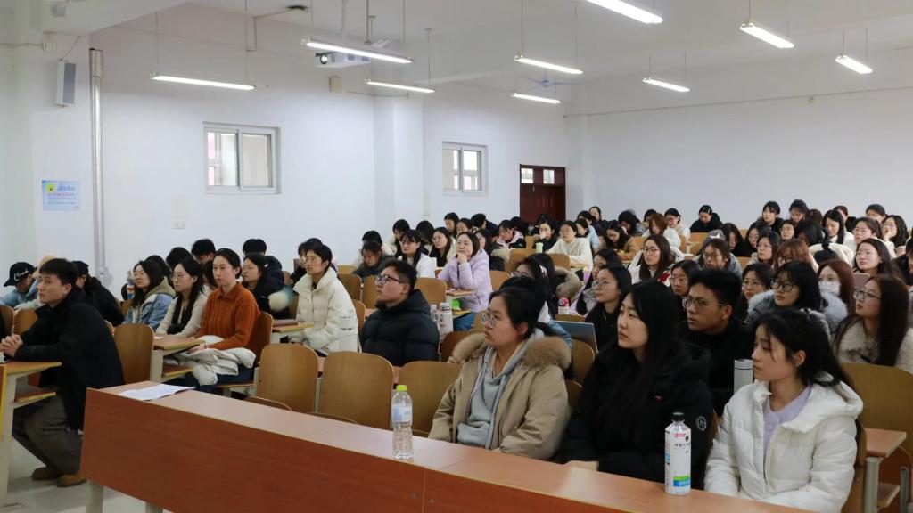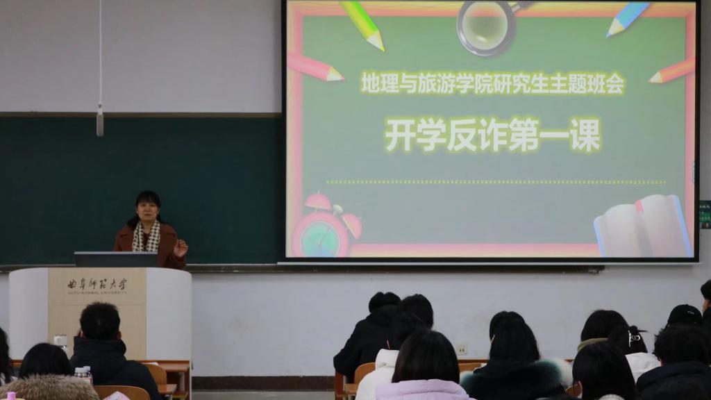 于S413教室开展“反诈第一课”主题班会,研究生辅导员赵岩主持,全体研究生参加。