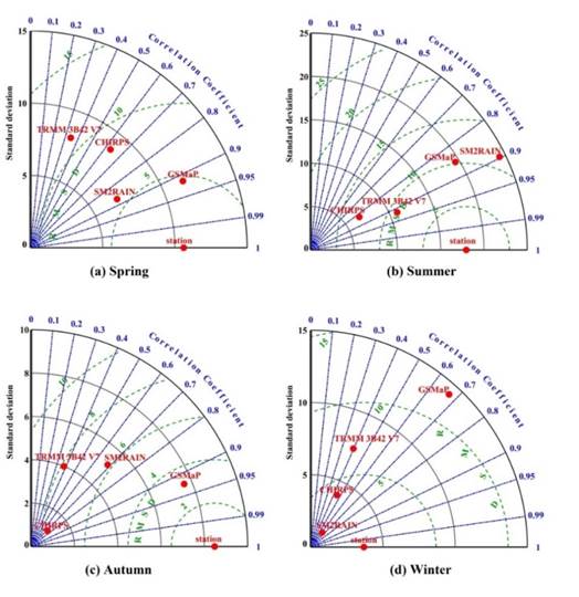 图1喀拉喀什河流域四套产品季节降水数据相对于观测降水的泰勒图