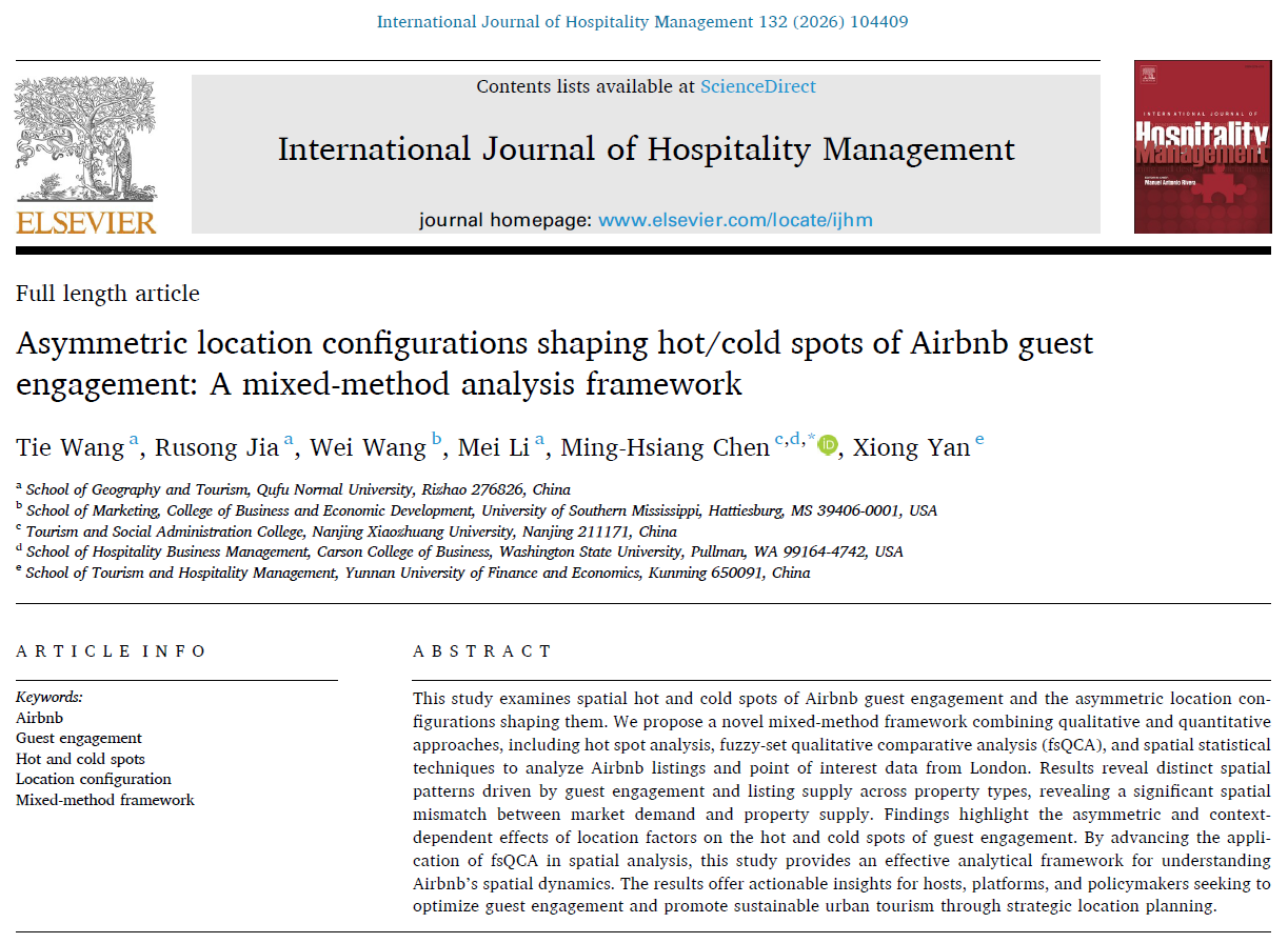 王铁教授团队联合Washington State University、University of Southern Mississippi和云南财经大学等国内外高校,在International Journal of Hospitality Management(IJHM)上发表了题为“Asymmetric location configurations shaping hot/cold spots of Airbnb guest engagement: A mixed-method analysis framework”的研究论文。International Journal of Hospitality Management是全球酒店管理领域顶级学术期刊,五年平均影响因子达到10.3,为JCR一区、中科院管理学一区TOP期刊。黄金城官网