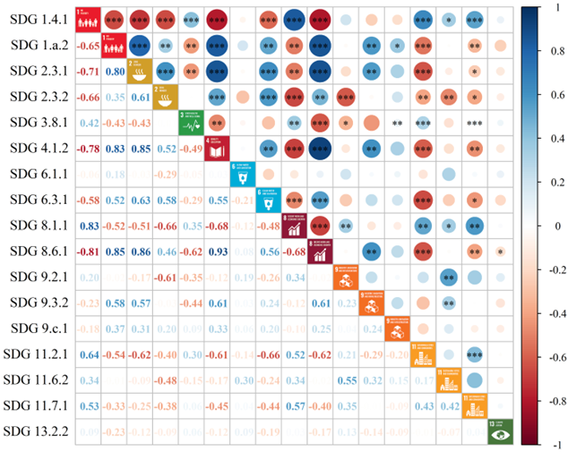 地理科学与资源研究所拉萨高原生态试验站开展合作,聚焦西藏自治区SDGs实施进程,深入开展了SDGs多目标动态变化与复杂关系的系统研究。该研究基于联合国SDGs框架,构建了适用于高寒高原地区的可持续发展评估体系。研究综合运用均衡性分析、空间探索性数据分析和Spearman相关性分析等方法,定量揭示了西藏县域尺度SDGs实施的时空演变规律、区域差异及多目标间的协同与权衡关系。研究发现:2015-2022年西藏可持续发展水平有所提高,其中SDG 11.6.2增加了79%。从空间格局来看,东南部县域的可持续发展表现普遍优于西北部地区,低值区主要集中在羌塘高原一带。研究还发现,各SDGs指标在县域间存在明显的空间异质性,且其空间关联强度随时间推移呈减弱趋势。交互分析表明,67对SDGs指标存在23对协同效应和18对权衡。基于上述发现,研究借鉴“分类—协调—协作”系统路径,结合西藏实际提出了三项促进区域可持续发展的政策建议。