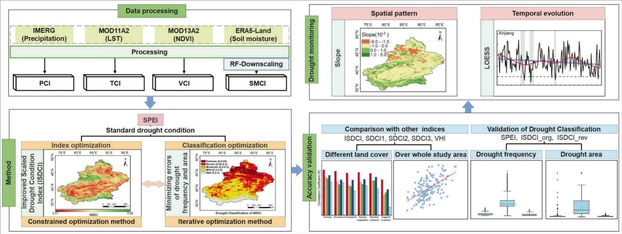 相关成果以 “Development of an Improved Scaled Drought Condition Index (ISDCI) Incorporating Soil Moisture for Drought Monitoring in Xinjiang”为题,发表在环境科学与生态学一区TOP期刊Ecological Indicators(影响因子7.4)上。黄金城官网