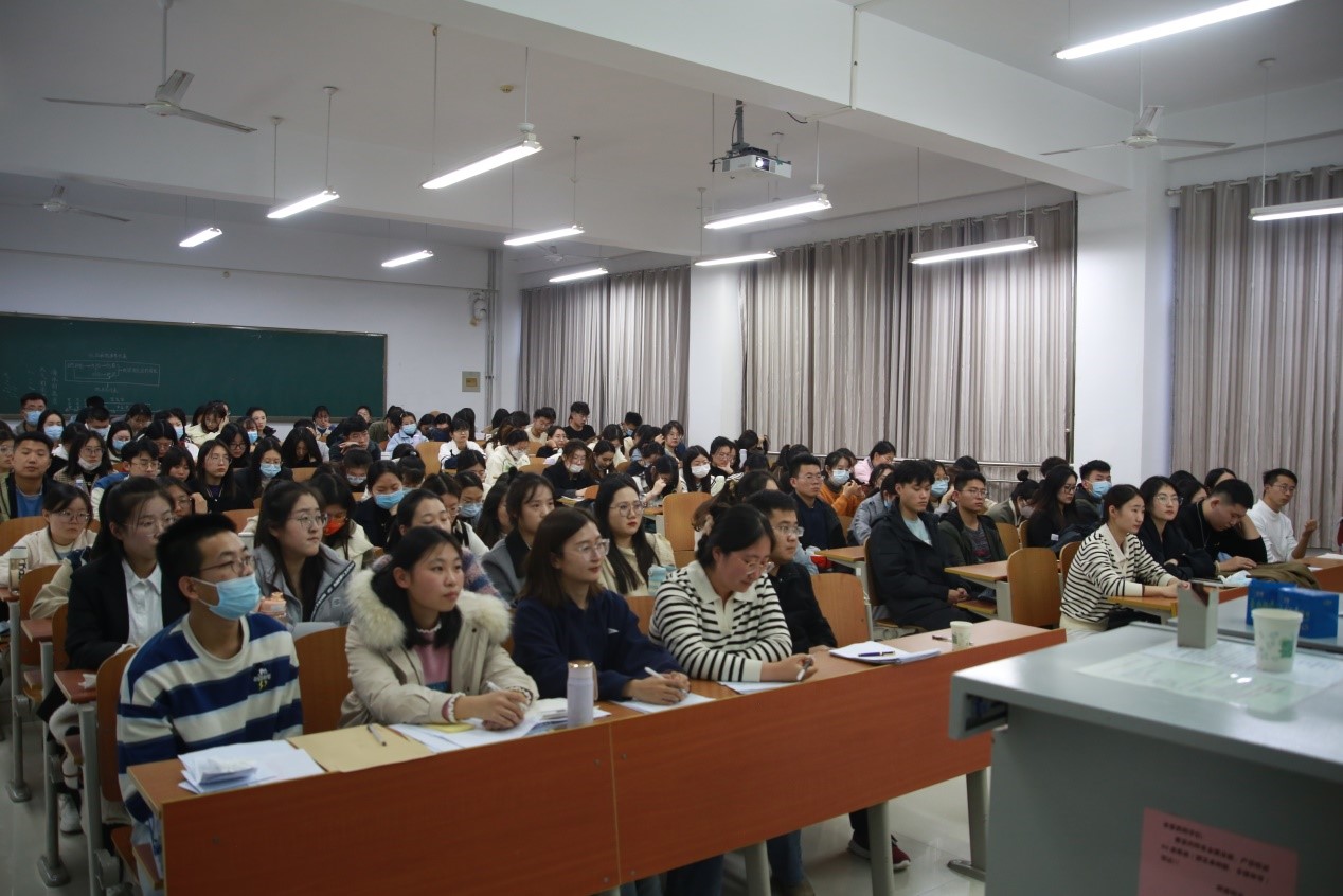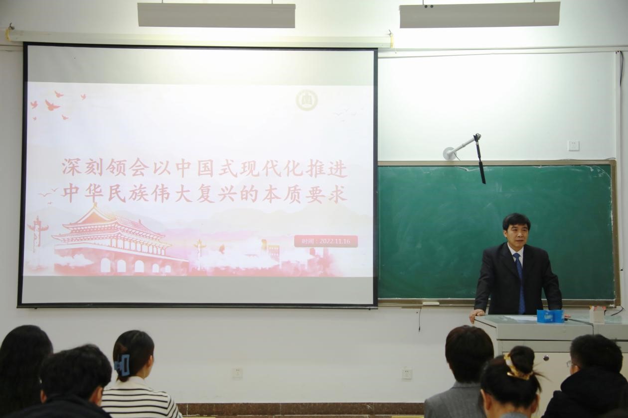 党委书记苏占兵在S314教室为研究生全体党员宣讲党的二十大精神。