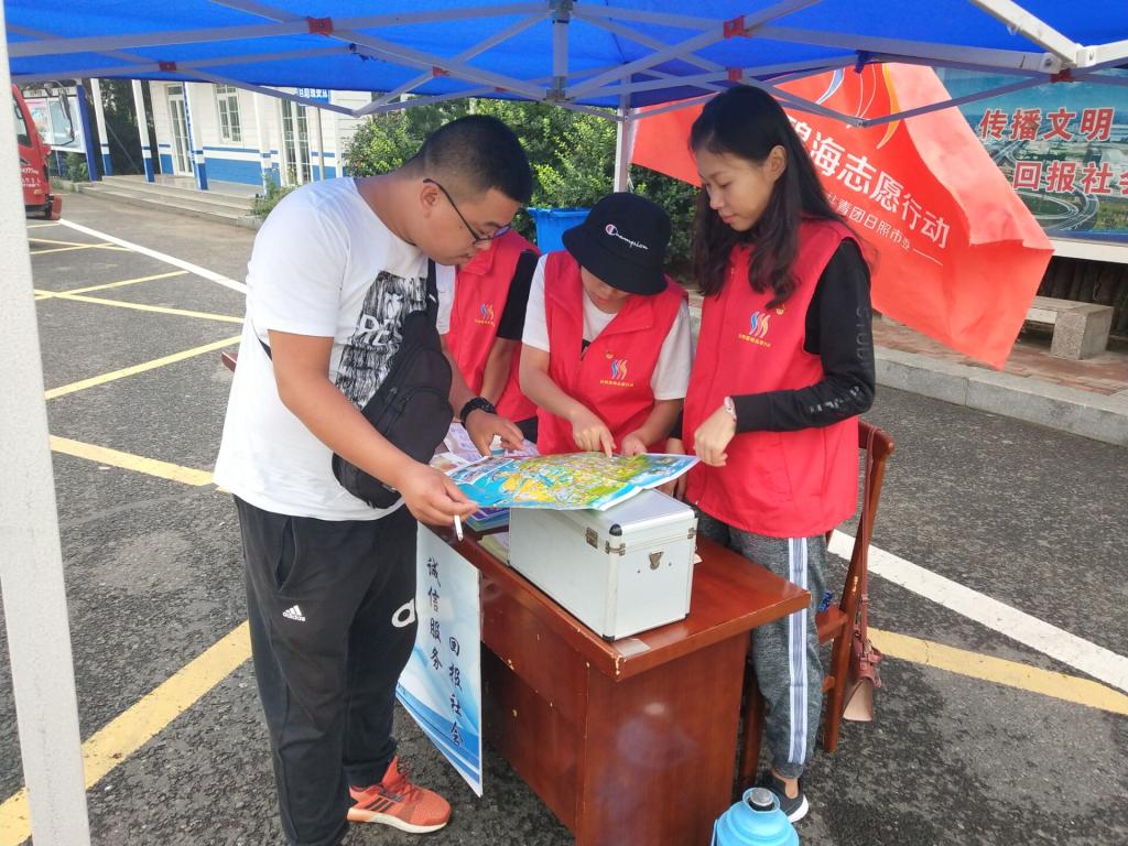 志愿队在两个高速出口设立便民服务站,积极为在服务站停车休息的乘客提供热水以及旅游咨询,大力宣传日照,展示日照。为了配合全国扫黑除恶行动,志愿者还向过往群众发放扫黑除恶专项宣传资料,宣传活动的重要性和相关政策法规,提高群众的监督意识。有身体不适的乘客,志愿队成员细心地为他们基本的帮助和简单的治疗,即使是阴雨连绵也丝毫不减志愿队的热情。队员们文明引导、积极作为,贴心周到的服务获得了过往群众的一致好评。