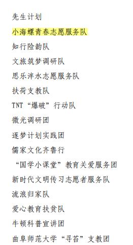 “古建巡礼,执笔绘梦”实践队、“文化邮递”实践队获校级特等奖,小海螺青春志愿服务队获校级一等奖,美丽乡村建设实践队获校级二等奖,“三寻筑梦”调研队、“荷风习习”实践团、向阳花实践团、“日照东方,游在五莲”调研团、“情暖乡村,圆梦中国”、复绿生态实践团获校级三等奖。