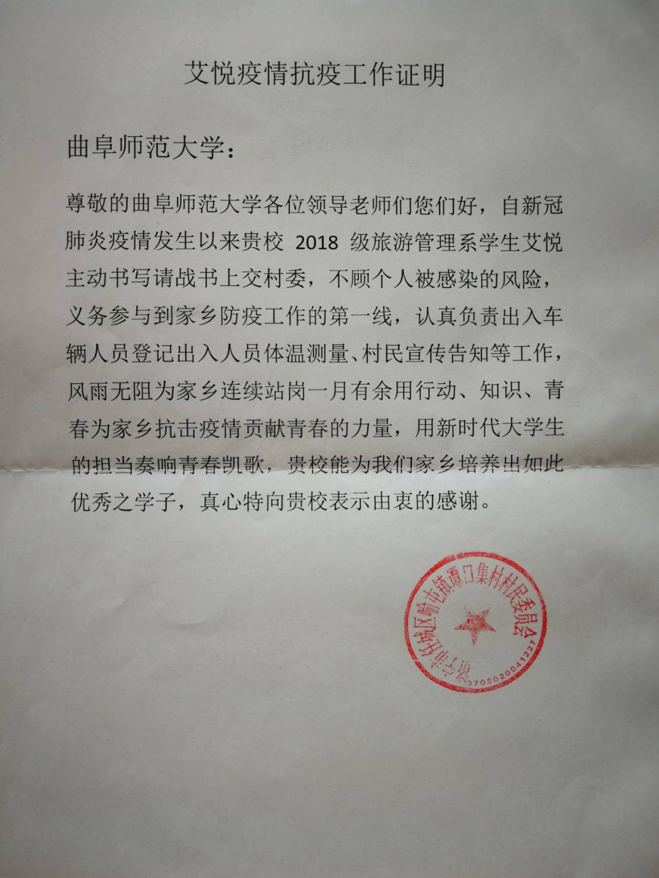 收到了来自济宁市地方村委的一封感谢信,感谢黄金城官网