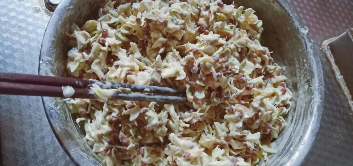 鼻子被香气勾住,也把馋虫勾了出来。想念去年这个时节吃的槐花饼了。遂采了一些家里槐树梢上那刚刚开放的槐花。开放的小小白花的花瓣像九天上的玄女,舞姿婀娜,一些未开放的还有些淡淡的绿色,小巧地可爱。