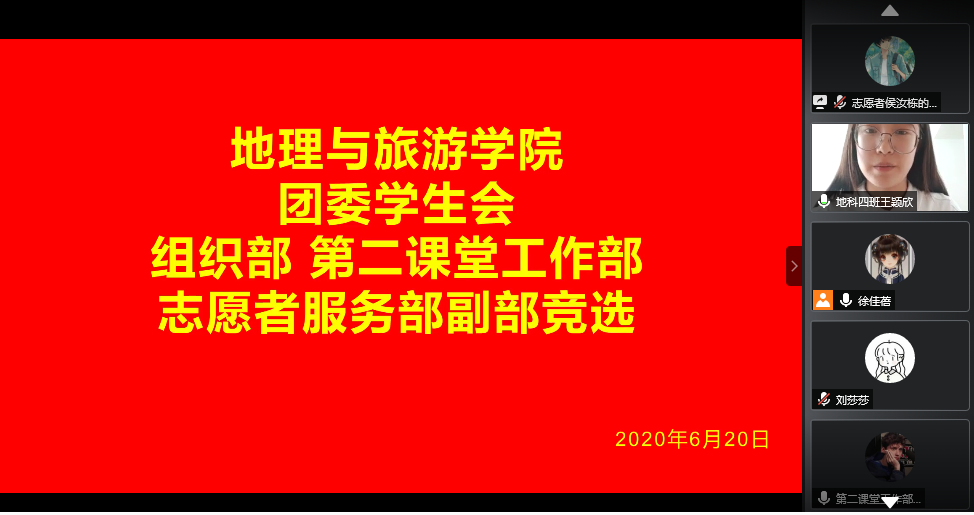 于6月20日采用线上形式举行2020届团委学生会副部长竞选答辩会。本次答辩会由2020届团委学生会主席及各部部长担任评委,86名竞选者参加。
