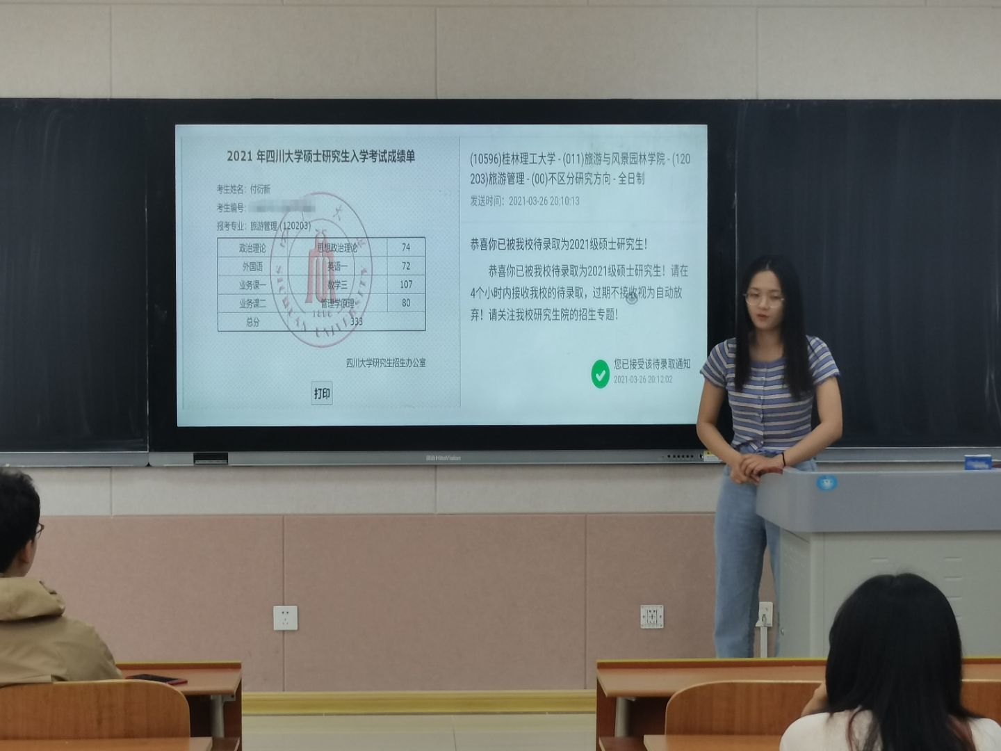于S214、S313举行考研经验交流会。交流会由赵树涛、付衍新、陈秀珍、张茹、彭敏五位优秀考研上岸学子担任主讲,2019级土地资源管理班和旅游资源管理班全体学生参加。