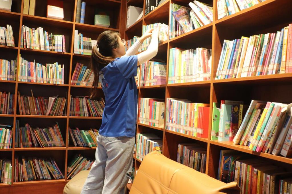 小海螺青春服务队之外,还有别的志愿者在进行书籍整理工作,可见社会各界都在关注文化强国,希望通过城市书房这一种形式来丰富人民的生活。
