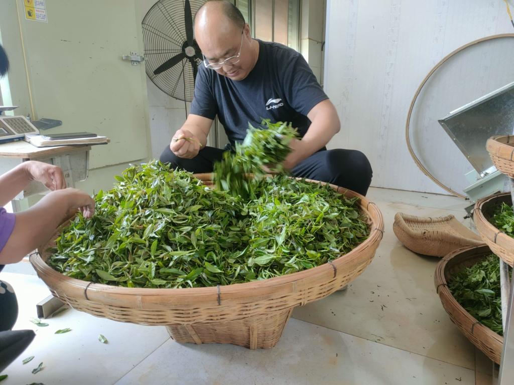 实践队成员跟随吴师傅走入茶厂。吴师傅边带领成员参观,边介绍女儿茶种植技艺,其独特的种植技艺是女儿茶被评为非物质文化遗产的原因之一。采访过程中,吴师傅亲自演示如何挑拣茶叶,边挑拣边向小队成员介绍,“比较大的叶片一般就是老叶子,是都要挑出来的,挑拣出来的叶子基本就没有什么用了”。在小队成员参观过程中,不时有茶农送来刚刚采摘下的新鲜茶叶。
