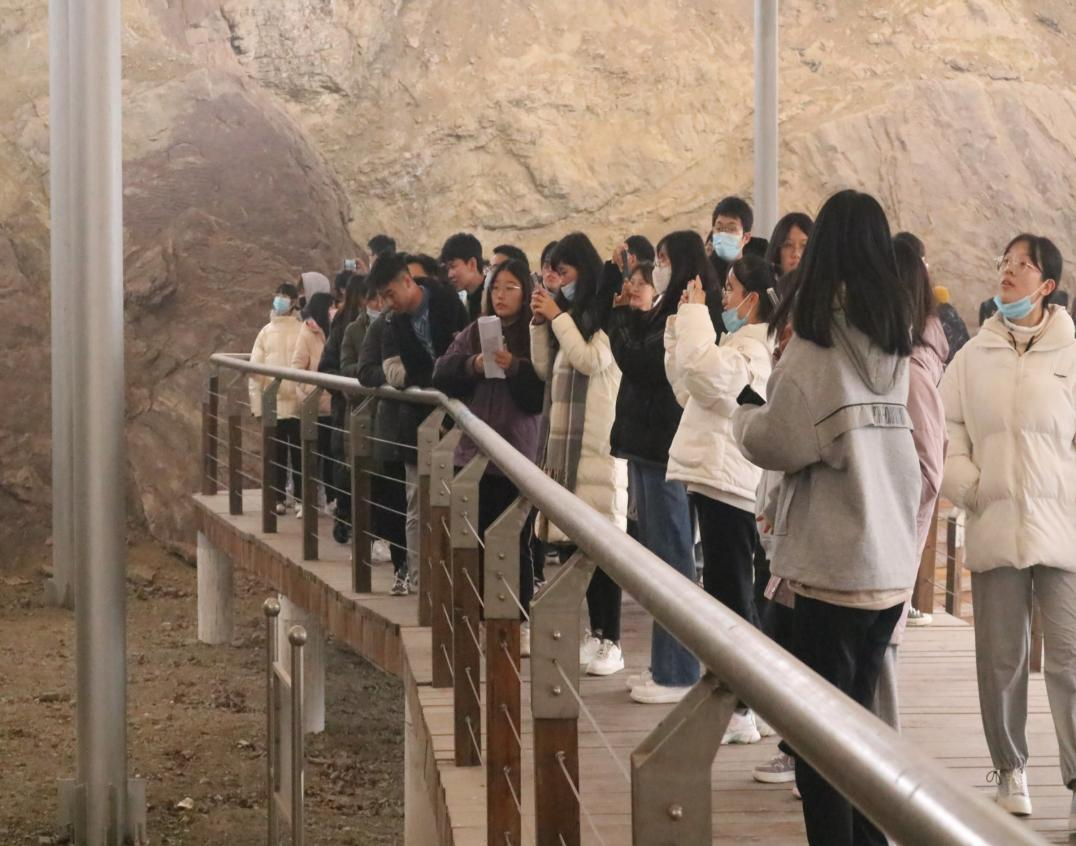 因受新冠疫情影响,中断一个多月的2020级地理科学专业自然地理综合实习在12月11日至12日继续进行。本次实习刘飞、秦霞、张琦、刘艳、马振华、孙博雯等指导老师带领下,赴临沂市郯城县、临沭县、平邑县三地,开展地质学、水文学、土壤地理学、植物地理学等相关专业内容的学习。院党委副书记刘伟跟车一同参加了实习。11日,师生们首先参观了沂河刘家道口节制闸以及分沂入沭彭庄节制闸,通过孙博雯、刘飞老师的讲解,详细了解了沂沭河流域的水系与水文特征,以及河流中游水利设施在防洪、灌溉以及城市景观塑造等方面的重要作用。在岌山地质公园,张琦老师带领同学们观察了恐龙足迹、褶皱构造、中生代砂岩层面上的波痕、雨痕、泥裂等层面构造现象,收获颇丰。下午,同学们前往沭河湿地公园,进行湿地植物学实习,秦霞老师讲解了河流生态湿地的重要性。升级改造后的郯城县马陵山地质公园肃穆庄严,同学们参观了1668年郯城大地震麦坡遗址,通过马振华老师的讲解和指导,各小组测量麦坡地震断层的产状,了解了地层的接触关系、新老顺序以及反应的地质营力方向。理论联系实际,巩固了专业基础理论知识。