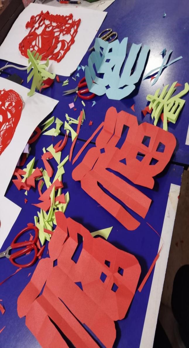 在学习完成了第一副作品后,迟老师又向队员们展示了“福”字的制作过程,成员们纷纷跃跃欲试。在老师的细心指导下,相比于第一次的茫然和谨慎,队员们这次变得更加有信心。“‘福’字没有‘春’字的对称结构,因此剪裁难度要更大,步骤更多,所以我们要分成左右两部分进行。”迟老师说道。通过老师不断地讲解和示范,成员们逐渐熟悉了剪刀的用法,“福”也有了雏形。在一番努力下,队员们成功剪出了红红火火的“福”。