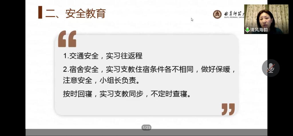 主题班会上,辅导员老师分别从疫情防控工作、实习支教安全、学风建设、校园安全、考研就业等方面开展宣讲。李梅老师希望2019级同学们要明确自己的职业规划,制定合理的人生目标,奋发学习,在教育实习中增长才干,寻找自己的人生定义。田青老师号召同学们注意消防安全、交通安全、人身安全、财产安全,安全用电,合理上网,坚决杜绝乱搭电线、杜绝安全隐患;在疫情防控常态化时期,要继续坚持“非必要不外出”原则,按时报告个人健康信息,坚决落实好疫情防控责任;在疫情防控特殊时期,要合理安排毕业论文撰写、考研复试、考公考编、就业择业等,防范就业领域的诈骗。张乃宁老师鼓励同学们刻苦学习,充分利用时间做有意义的事,加强体育锻炼增强体质;在强化专业课学习的同时,要积极参与科创类比赛,不断提高自身综合素养,提前做好生涯规划。董青老师希望同学们养成良好的学习习惯和生活习惯,引导同学们遵守黄金城官网