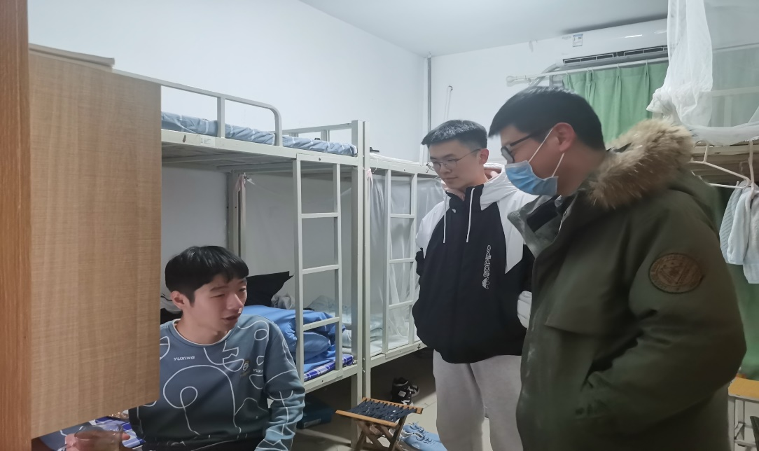 2018级辅导员田青、2019级辅导员李梅、2020级辅导员张乃宁、2021级辅导员董青前往学生宿舍,给返校同学送去关怀和慰问并开展宿舍安全隐患排查工作。