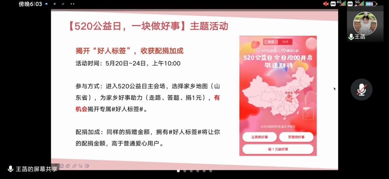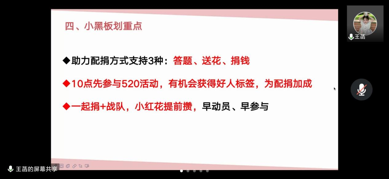 会上,王菡向与会人员详细介绍了腾讯会议配捐规则、“希望小屋”活动参与方式,并着重讲述了组建队伍和配捐的流程和助力捐配的要点,即助力捐配有三种方式:答题、送花、捐钱。她强调,要积极参与5·20活动,获得好人标签,为配捐加成;要创建一起捐+战队,提前积攒小红花;鼓励各班团早动员、早参与。