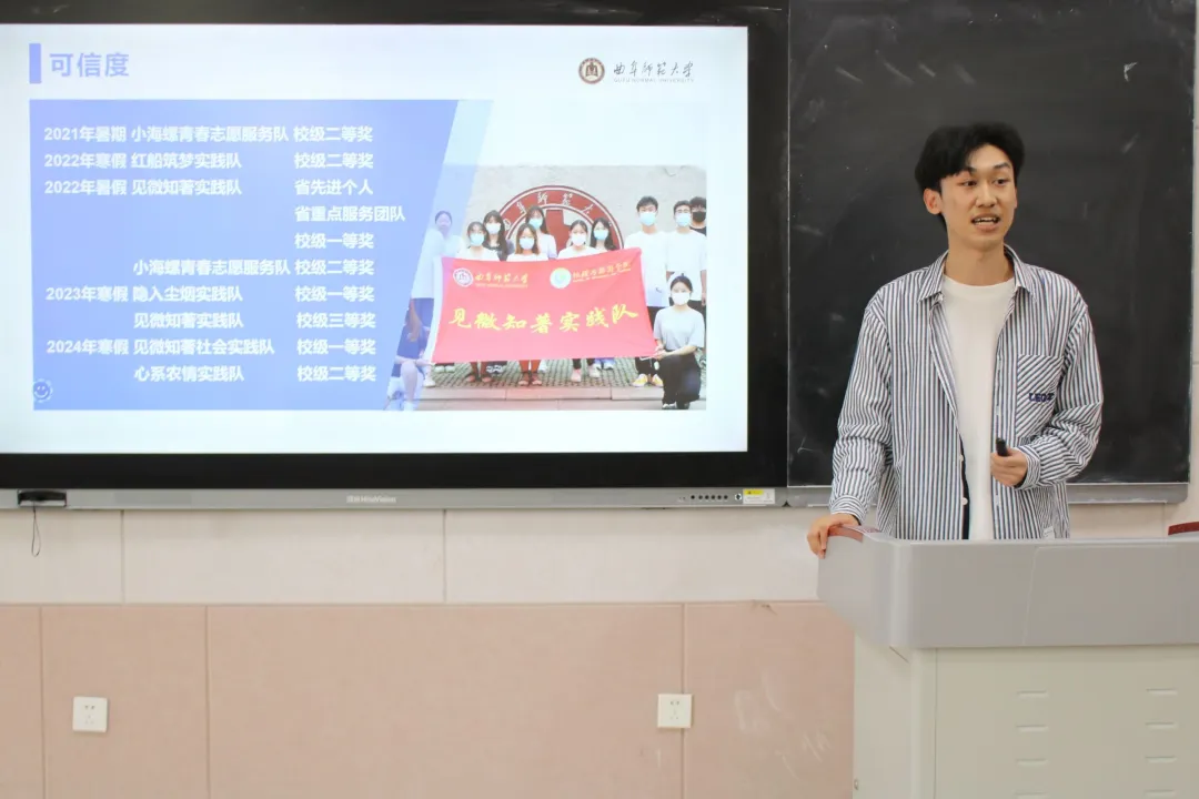 随后,社会实践部副部长刘欣然从“七彩假期”全国大学生暑期社会实践专项活动、全国大中专学生志愿者暑期文化科技卫生“三下乡”社会实践活动、中国大学生知行促进计划三个方面分别展开对暑假社会实践活动的详细介绍,并阐明社会实践前期队伍指导老师及队员的选择、中期开展实践及投稿、后期答辩的关键要点和注意事项。