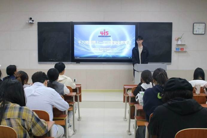 学子深刻认识国家安全的丰富内涵与重要意义。随后,安全管理部成员为同学们播放国家安全教育视频,现场学习氛围浓厚。视频开篇以甲午海战为切入点,直观展现国家安全对于国家存续、发展的关键意义,紧接着引入我国总体国家安全观,深入阐释其内容与深远意义,同学们专注聆听、不时低头记录重点。视频从现代守护国家安全的实例出发,剖析捍卫国土安全、网络安全等领域安全的必要性,同学们因此表示切实感受到国家安全在当下的多元内涵与重要实践。最后,安全管理部成员呼吁同学们积极投身实践,争做新时代国家安全卫士,为维护我国国家安全贡献一份自己的力量。