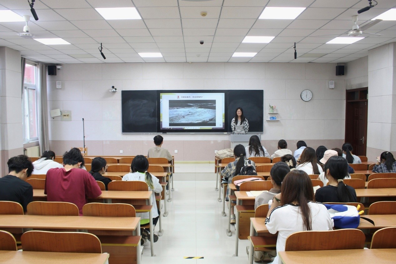 会议伊始,安全宣讲团成员窦林霞以汶川地震为切入点,详细阐释“全国防灾减灾日”设立的重要意义,让同学们深刻认识到防灾减灾的重要性。随后,宣讲围绕地震、火灾、台风及洪灾四大灾害展开,通过穿插图片对真实案例进行讲解,层层递进解析科学避险策略。针对地震突发场景,她详细介绍相应的避震方法以及“先躲后跑”的科学依据,并通过图片展示“生命三角区”的避险原理;在火灾自救部分,她从浓烟扩散原理出发,详细说明火灾逃生的核心步骤,提醒大家贴近地面行动的必要性;面对台风灾害,她强调关闭门窗、远离玻璃幕墙及户外危险物等关键措施;谈及洪灾应对时,窦林霞梳理迅速向高处转移、利用漂浮物保持体力的生存逻辑。