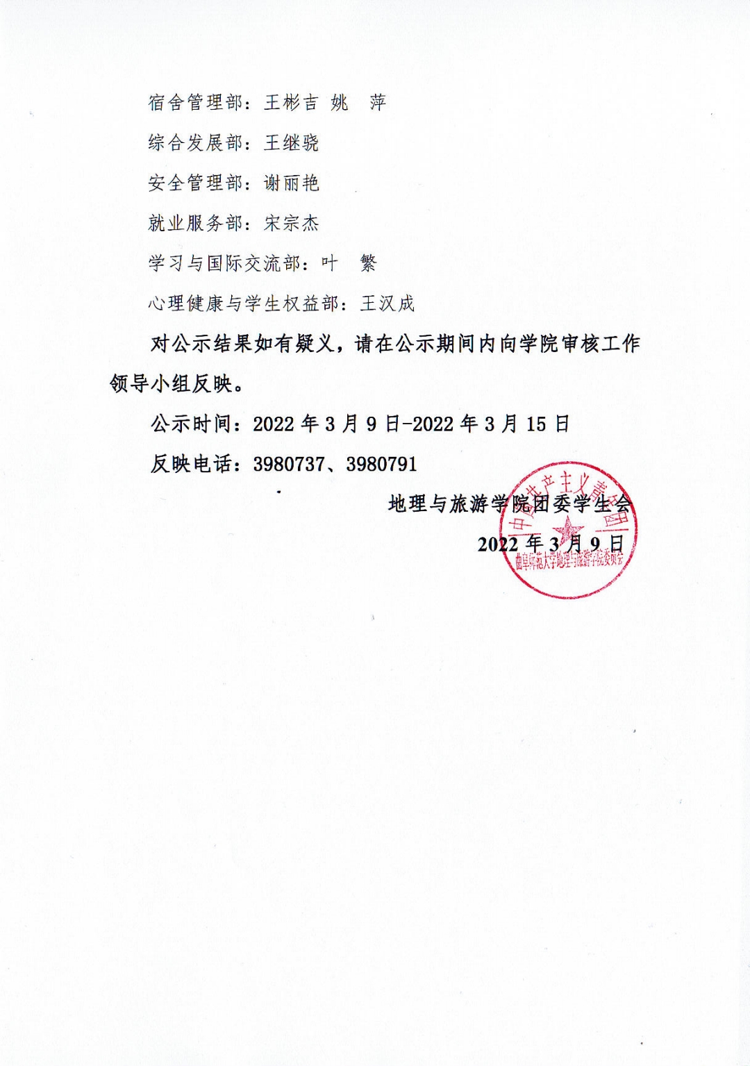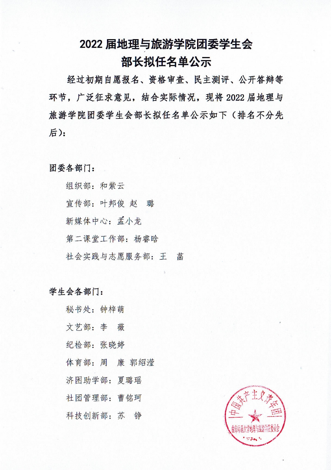 2022届黄金城官网 团委学生会部长拟任名单公示