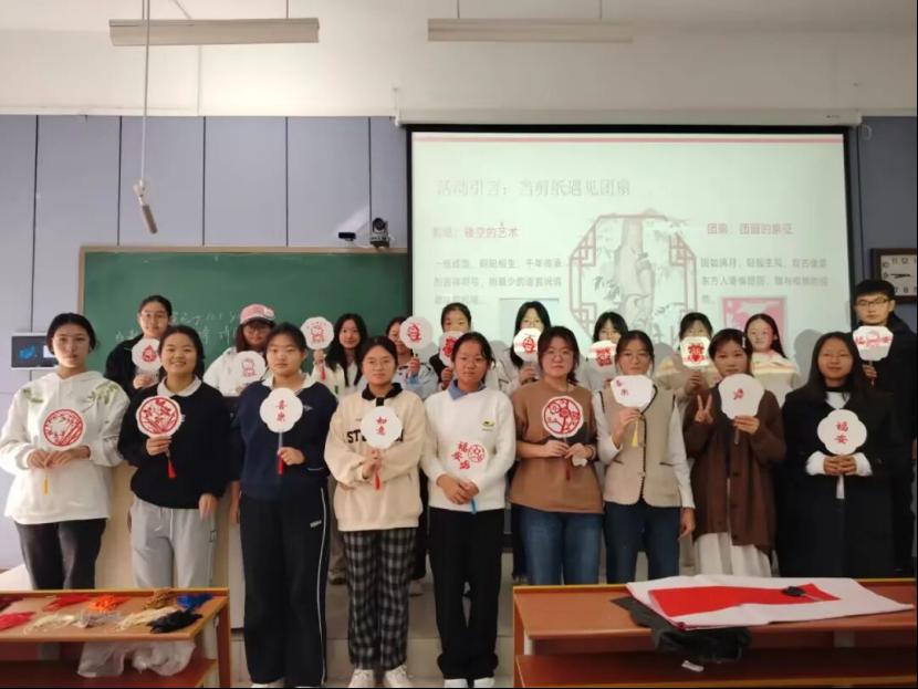 实操环节气氛热烈,新生们手持剪刀与素面团扇,按照指导有条不紊地动手创作。有的同学选择清雅的“梅兰竹菊”图样,细心修剪花瓣纹路;有的偏爱灵动的“蝶戏牡丹”,反复调整图案在扇面的位置;还有同学相互请教流苏打结的技巧,分享剪纸时的小窍门。当一张张精致剪纸贴合扇面,再挂上飘逸的流苏吊坠,原本素净的团扇瞬间变得雅致鲜活。看着自己亲手完成的作品,新生们满脸成就感,现场笑声与赞叹声不断。