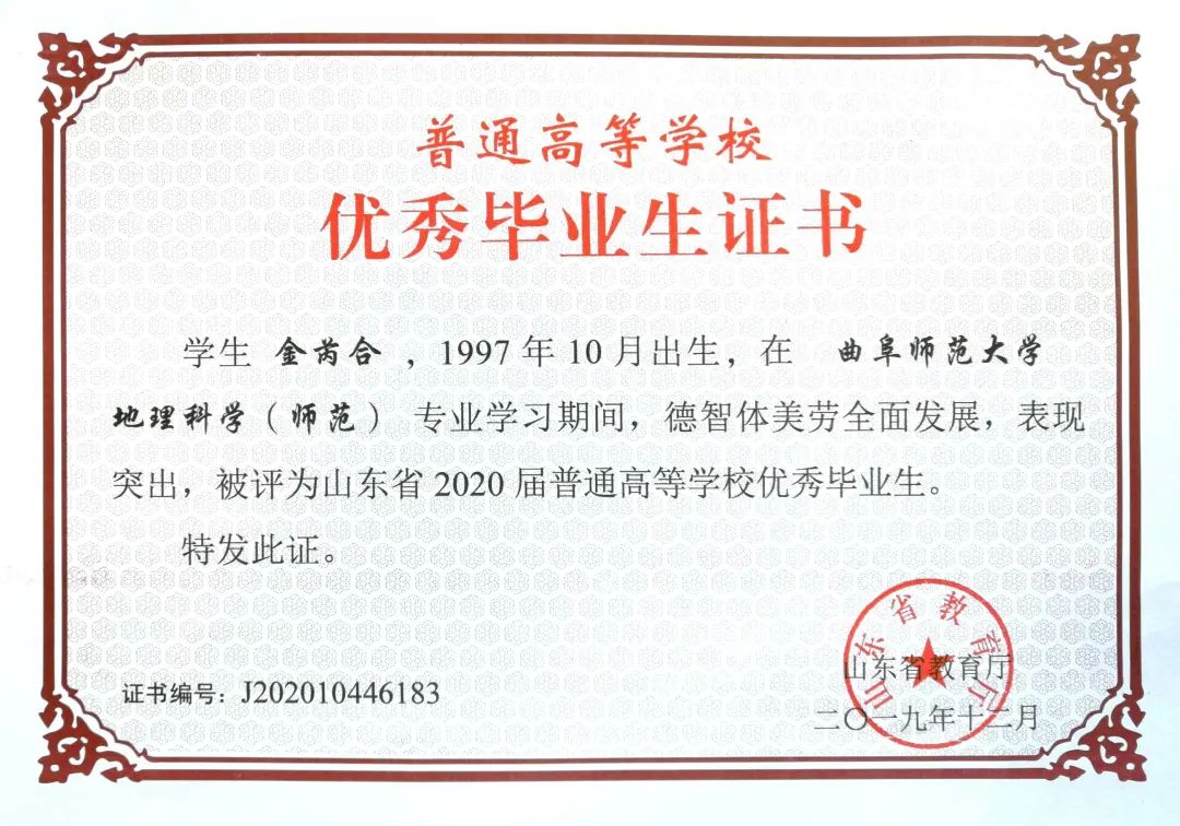 自然地理学专业攻读硕士研究生;在校期间曾多次获得“三好学生”(一等奖学金)、“三好学生标兵”等,还获得“国家奖学金”、“叶圣陶奖学金”、“校长奖学金”、“山东省优秀毕业生”、“十佳学子”等。课余认真学习英语与计算机知识,提升自身素质,成功考取了大学生四级、六级、“计算机二级MS Office高级应用”证书。