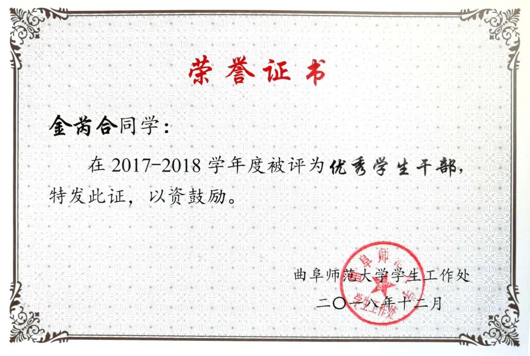 的模范班级,获得了“优秀团支部”、“百优班级”的称号。在学生会中,她不断完善提高自己,在磨砺中学会如何做人做事,学会团结协作和求同存异,在此期间受到老师和同学们的一致认可,多次荣获“优秀学生干部”、“优秀团员”、“优秀团员标兵”等荣誉称号。